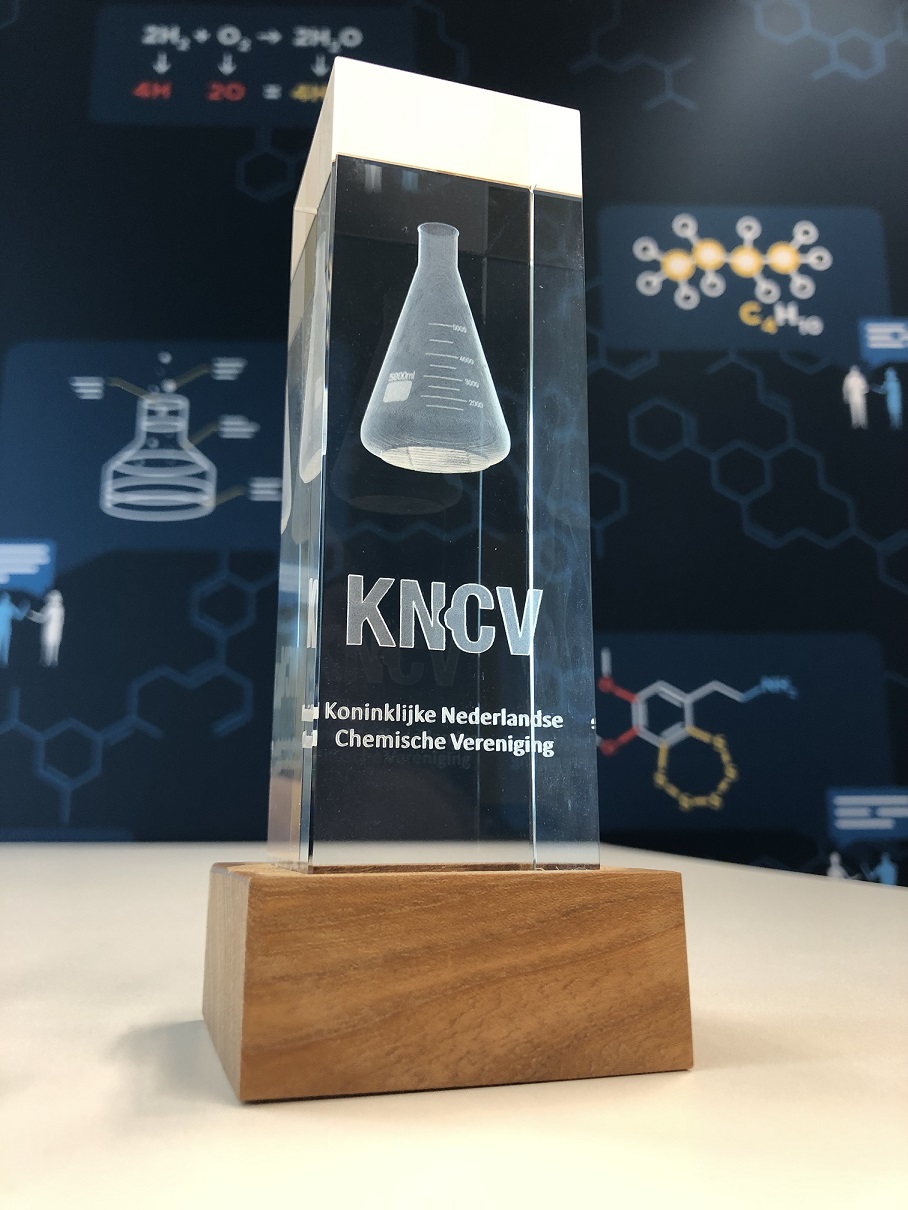 Hiermee beloont de KNCV jonge chemici met het behalen van hun diploma. Nieuw dit jaar is de glazen erlenmeyer die de winnaars ontvangen. Jan-Willem Toering, directeur van de KNCV: ‘We waren op zoek naar een symbool waarmee we de winnaars van een KNCV-prijs meer zichtbaar konden maken. Al onze prijzen houden hun eigen versierselen, maar voortaan ontvangen onze winnaars ook een echte award: de KNCV Erlenmeyer’
