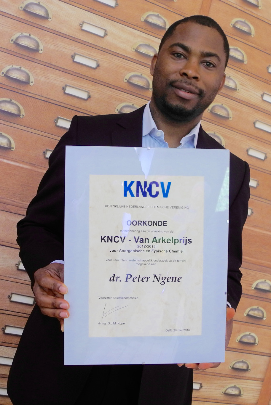 One of the main criteria for the price is that the wide field of physical and inorganic chemistry should benefit from the work. In this particular case of Peter Ngene’s research on nano confinement, it is widely recognized as being of crucial importance to the thermodynamic properties on the nano scale and probably one of the most important contributions of present day research. His recent appointment as assistant professor at Utrecht University in the department of Inorganic Chemistry and Catalysis guarantees a broader scope of interest than his former research field on the use of nano-confined metal hydrides namely as solid state electrolyte for rechargeable Li-ion batteries. As a further support, one of our reviewers remarked that such electrolytes will only function as such when strict consideration is given to the interface with the electrodes of the batteries.